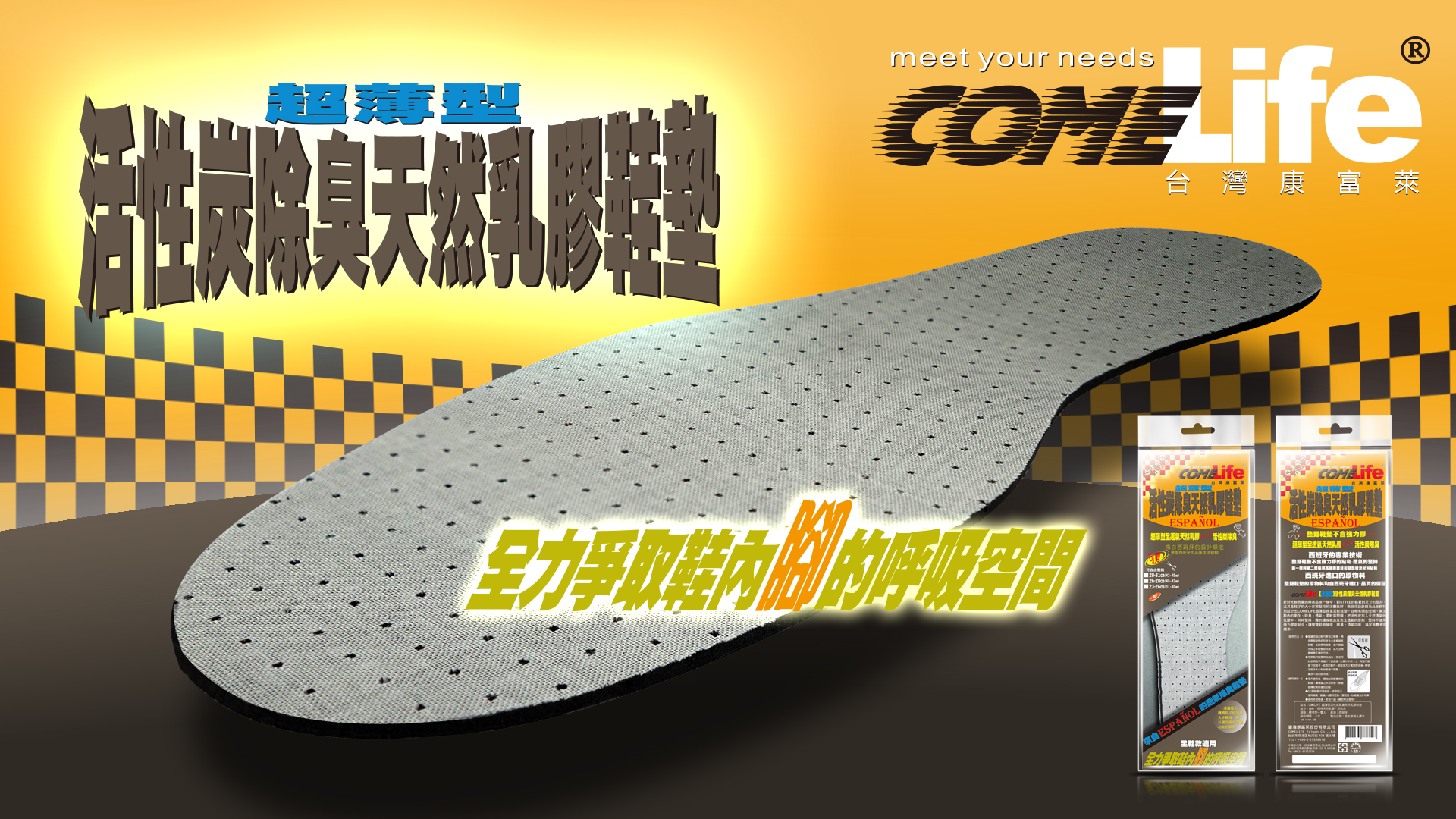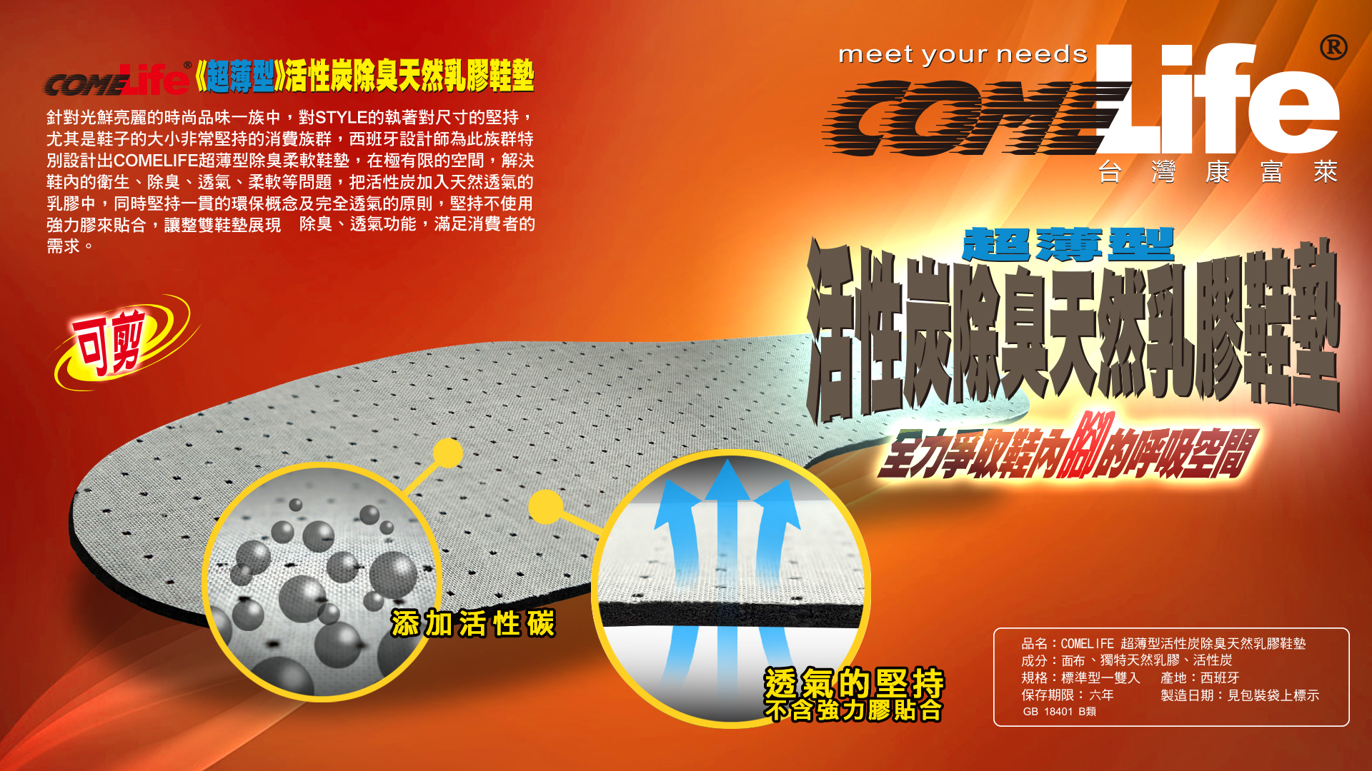 GB 18401 B類 COMELIFE 超薄型活性炭除臭天然乳膠鞋墊 整雙鞋墊不含強力膠 超薄型全透氣天然乳膠 PLUS 活性炭除臭 西班牙的專業技術 整雙鞋墊不含強力膠貼合 — 透氣的堅持 第一層與第二層採用高端專業技術聚酯發泡材料貼合 西班牙進口的原物料 整雙鞋墊的原物料均自西班牙進口 — 品質的保證 COMELife 《超薄型》活性炭除臭天然乳膠鞋墊 針對光鮮亮麗的時尚品味一族中,對STYLE