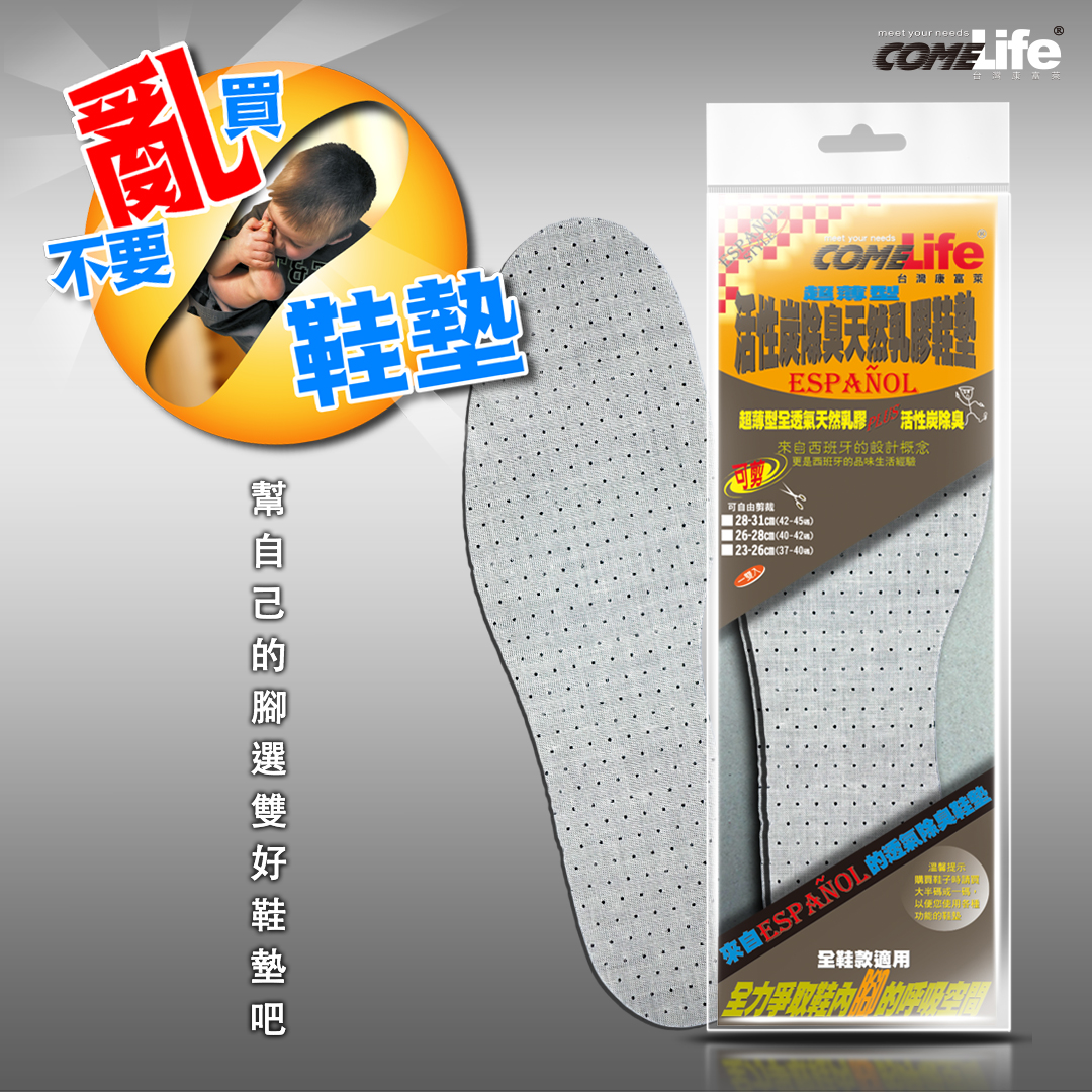 的執著對尺寸的堅持,尤其是鞋子的大小非常堅持的消費族群,西班牙設計師為此族群特別設計出 COMELife 超薄型活性炭除臭天然乳膠鞋墊,在極有限的空間,解決鞋內的衛生、除臭、透氣、柔軟等問題,把活性炭加入天然透氣的乳膠中,同時堅持一貫的環保概念及完全透氣的原則,堅持不使用強力膠來貼合,讓整雙鞋墊展現,除臭、透氣的功能,滿足消費者的需求。 《使用方法:》 - 建議您抽出鞋內原有之鞋墊,再依原有鞋墊內的形狀大小來裁剪本鞋墊,去除原有鞋墊,放入剪裁完成之本鞋墊即完成,此方法為最簡易正確的方法。