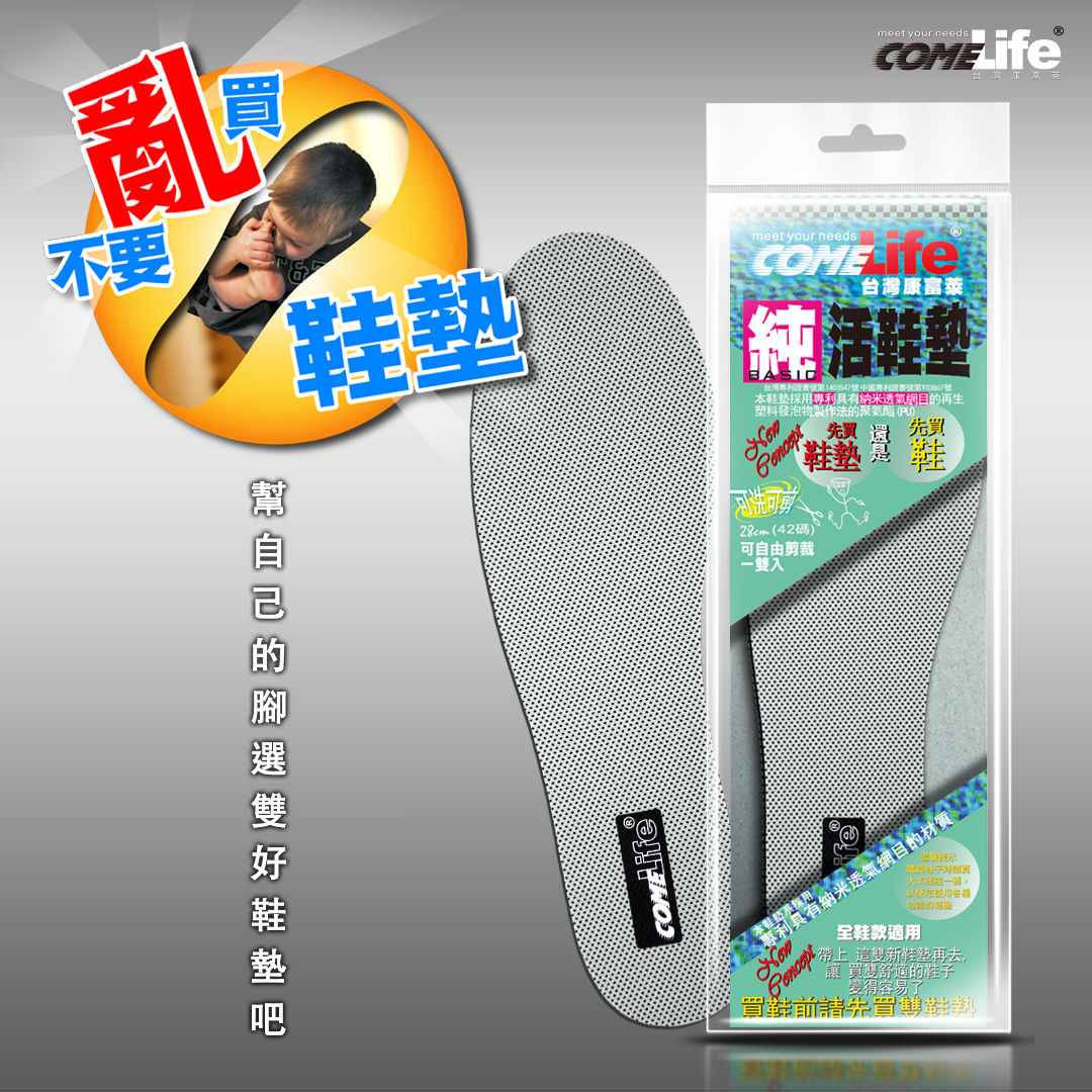 - 我們建議穿鞋子加上COMELife康富萊純活鞋墊,是邁向文明進步時尚的新慨念—柔軟、衛生。