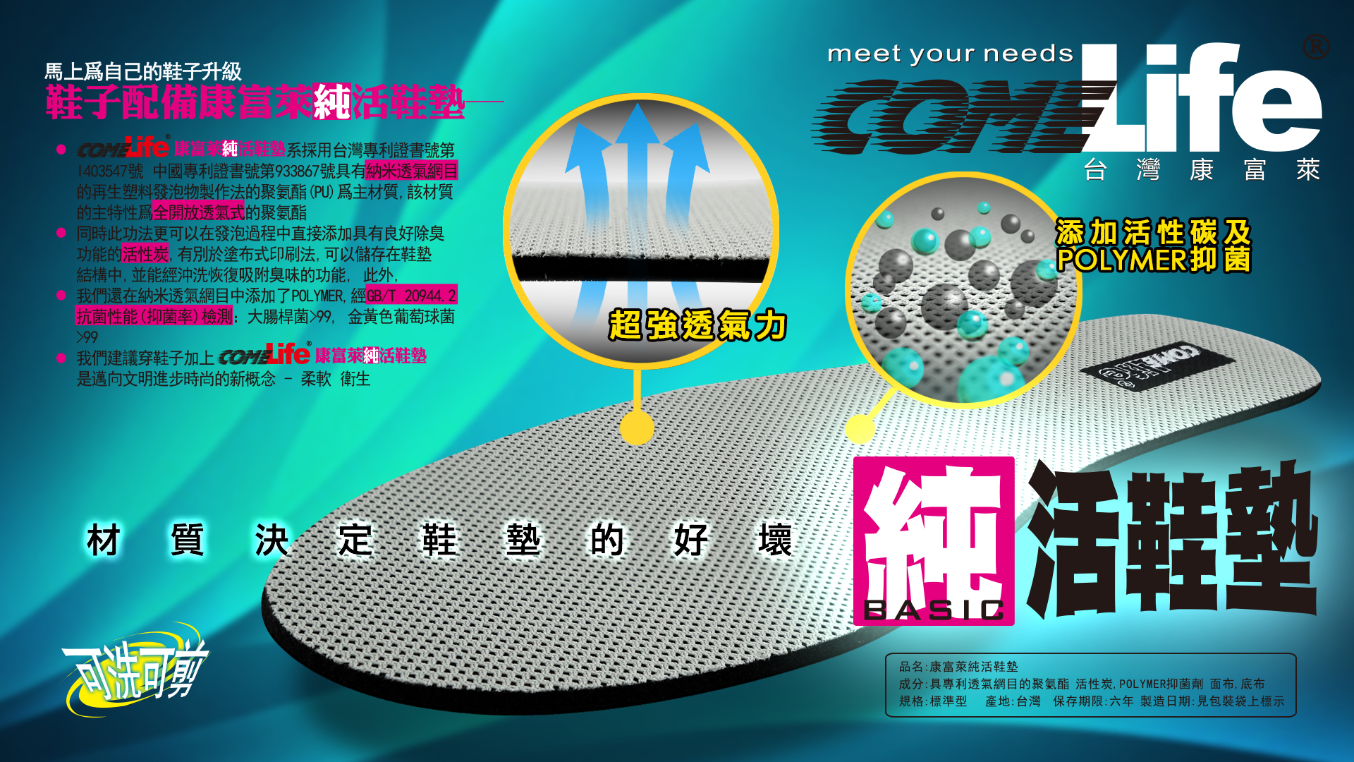 品質優良:專利開放式PU、活性碳、POLYMER、BK面布、POLYESTER伸縮底布製造的COMELIFE純活鞋墊