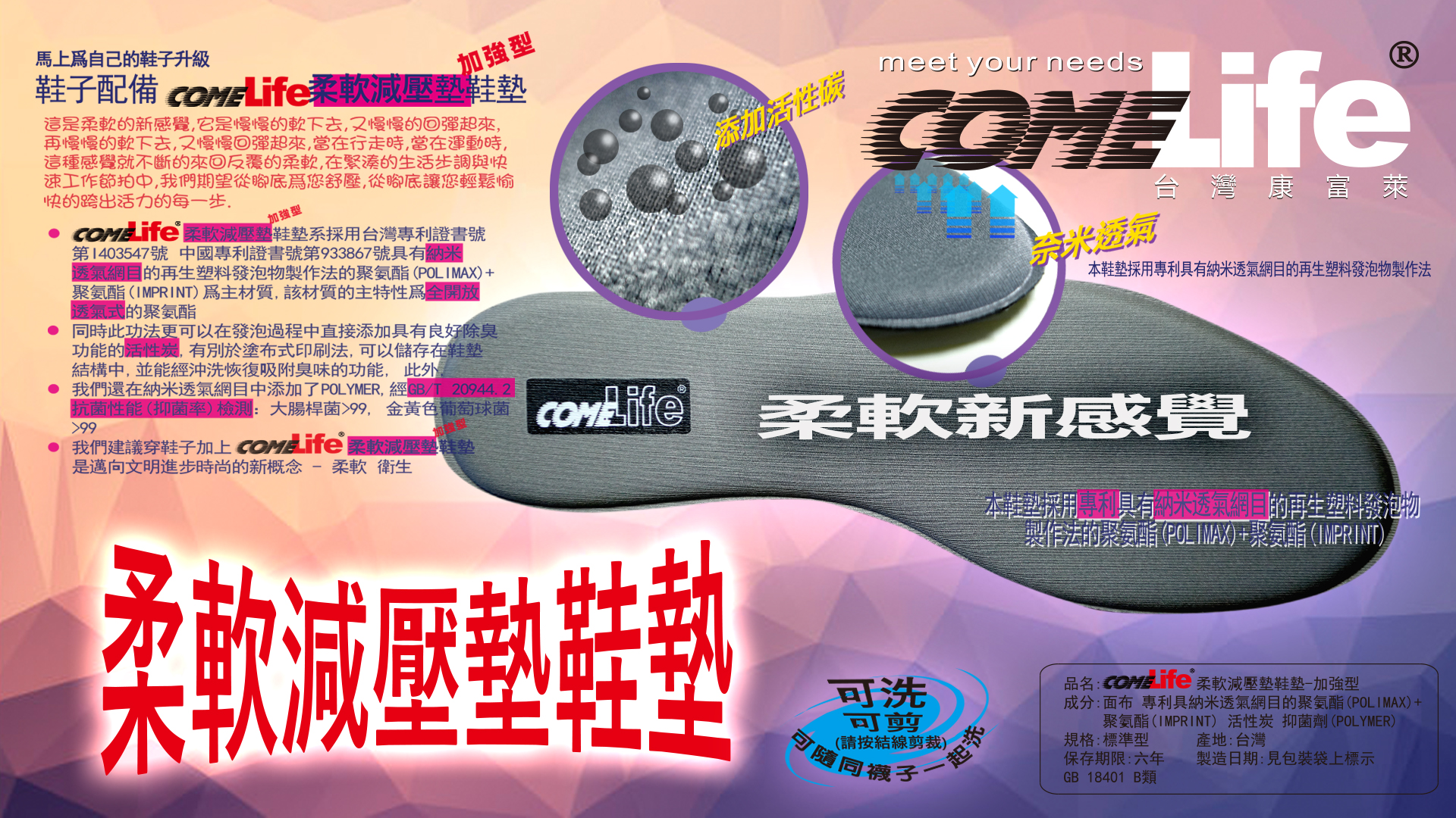 GB 18401 B類 COMELife 柔軟減壓墊鞋墊 加強型 台灣專利證書第 1403547 號中國專利證書第 933867 號 本鞋墊採用專利具有納米透氣綱目的再生塑料發泡物製作法的聚氨酯 (POLIMAX)+ 聚氨酯 (IMPRINT) 馬上為自己的鞋子升級 鞋子配備 COMELife 柔軟減壓墊 (加強型)鞋墊 - COMELife柔軟減壓墊(加強型)鞋墊 採用台灣專利證書第1403547號中國專利證書第933867號具有納米透氣綱目的再生塑料發泡物製作法的聚氨酯(POLIMAX)+聚氨酯(IMPRINT)為主材質,該材質主特性為全開放透氣式的聚氨酯。